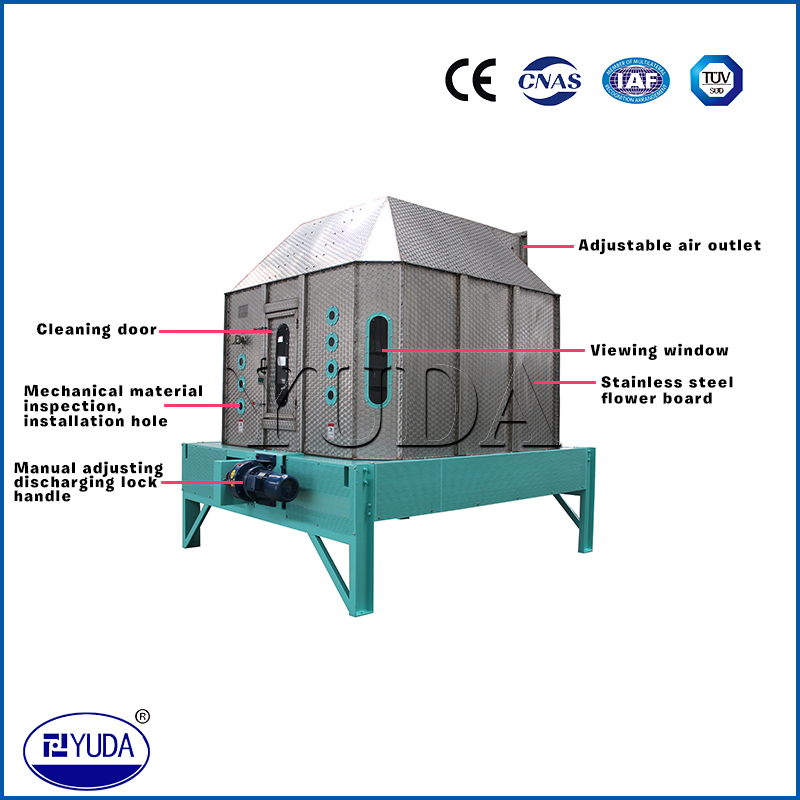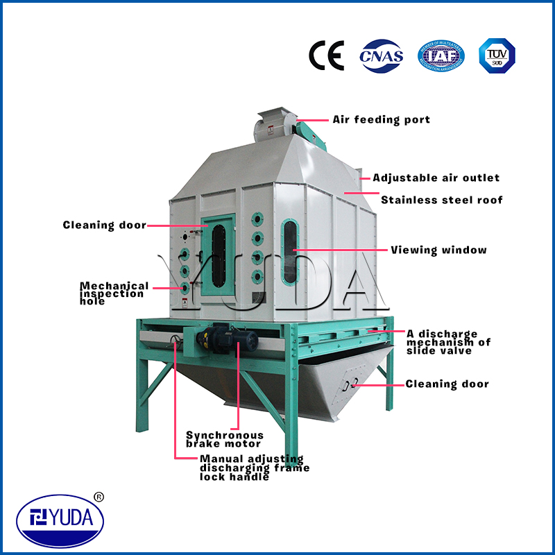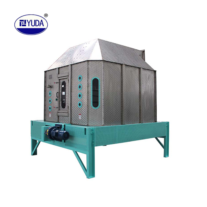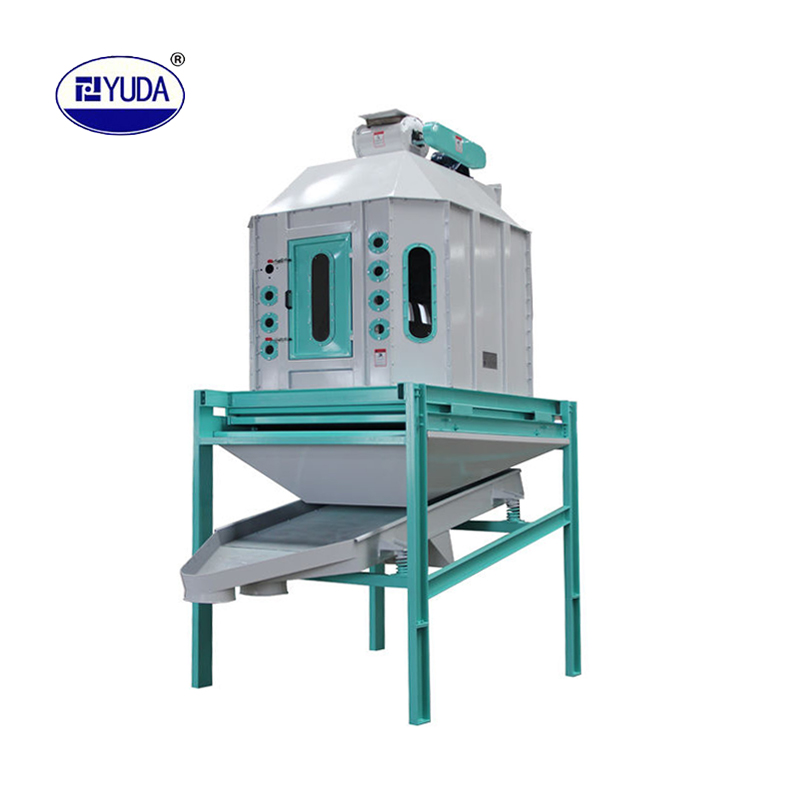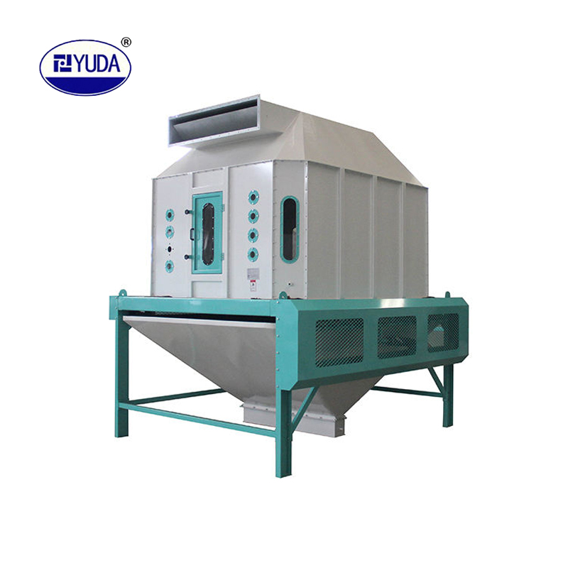顆粒料的冷卻是制粒工段中不可缺少的工序。逆流式冷卻器能將從制粒機(jī)出來(lái)溫度達(dá)70℃~90℃的顆粒料冷卻到略高于室溫3℃~5℃,并能降到安全水份(≤12.5%),這樣便于顆粒料的運(yùn)輸、儲(chǔ)藏和保管。逆流式冷卻器型號(hào)不同,其產(chǎn)量亦不同,它可適應(yīng)各種規(guī)模飼料廠使用。